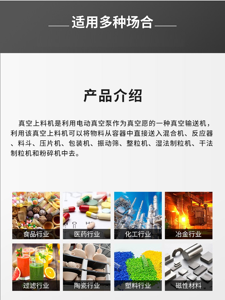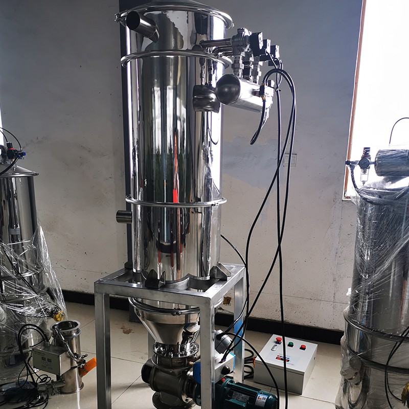 真空上料機(jī)是利用電動(dòng)真空泵作為真空愿的一種真空輸送機(jī),利用該真空上料機(jī)可以將物料從容器中直接送入混合機(jī)、反應(yīng)器、料斗、壓片機(jī)、包裝機(jī)、振動(dòng)篩、整粒機(jī)、濕法制粒機(jī)、干法制粒機(jī)和粉碎機(jī)中去。該機(jī)減輕了工人的勞動(dòng)強(qiáng)度,杜絕了粉塵污染,保證生產(chǎn)符合要求。